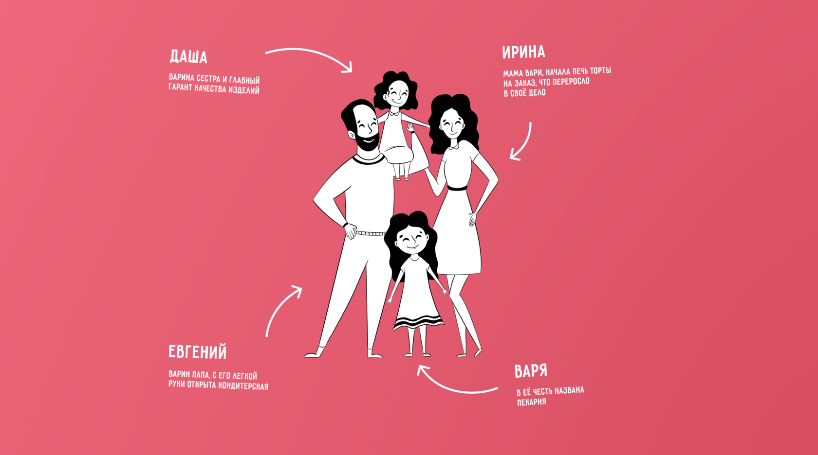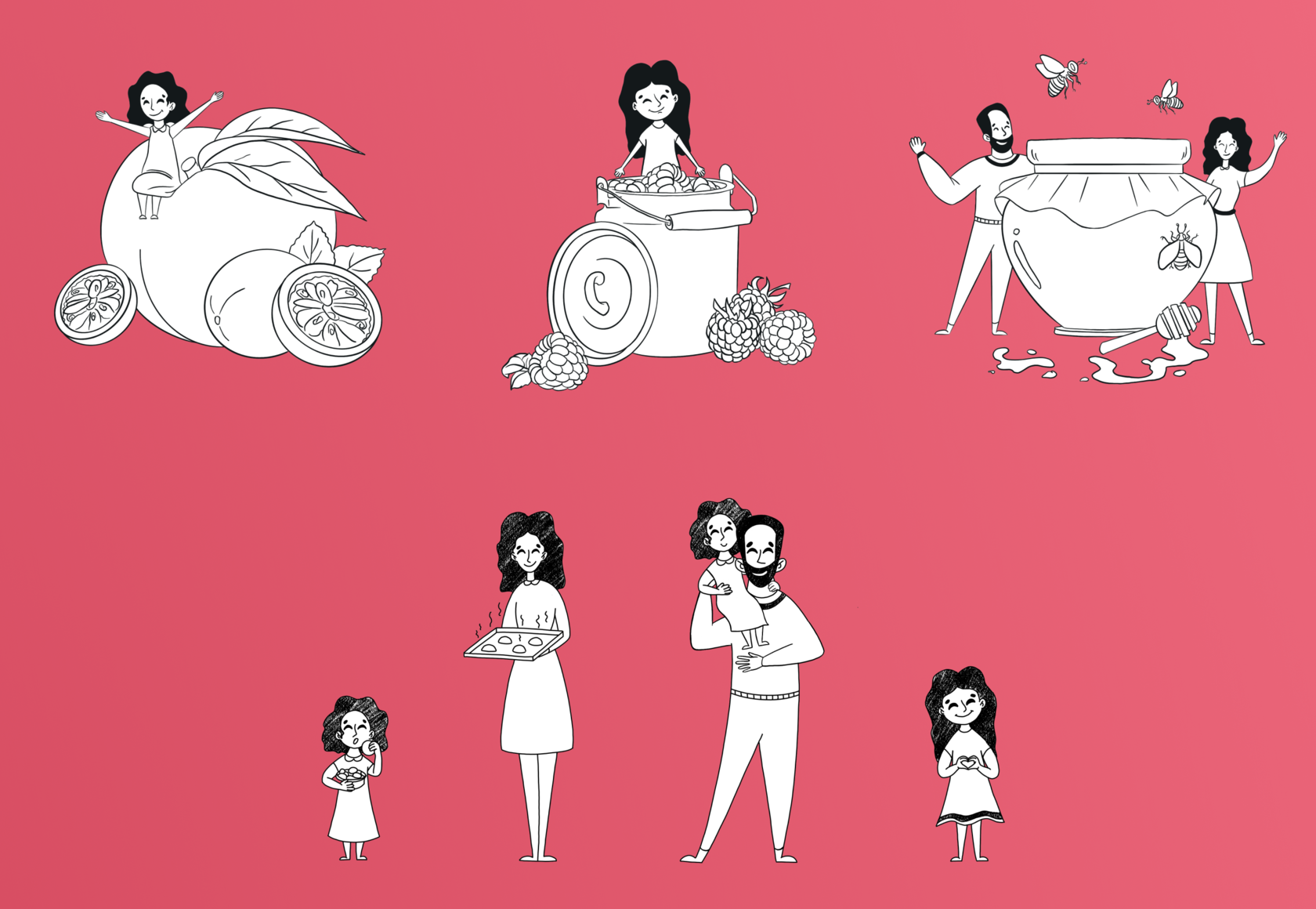 Мы начали с разработки персонажей для каждого члена семьи, добавляя сюжета в иллюстрации. Эти рисунки легли в основу упаковок для тортов «Варина мама».